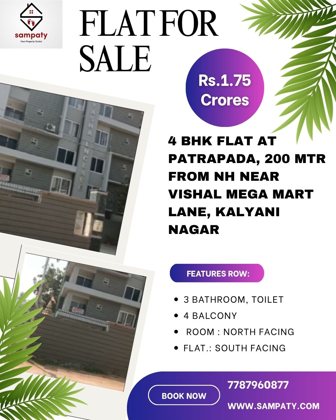 2250 sqft Super built area, 1550 Sqft Carpet area @ Rs.1.75 crores, Room North facing, Appt. South facing, 4 balcony with 3 Bathroom, 4 BHK Flat for sale at Jingyasha Enclave, Kalyani Nagar, Patrapada