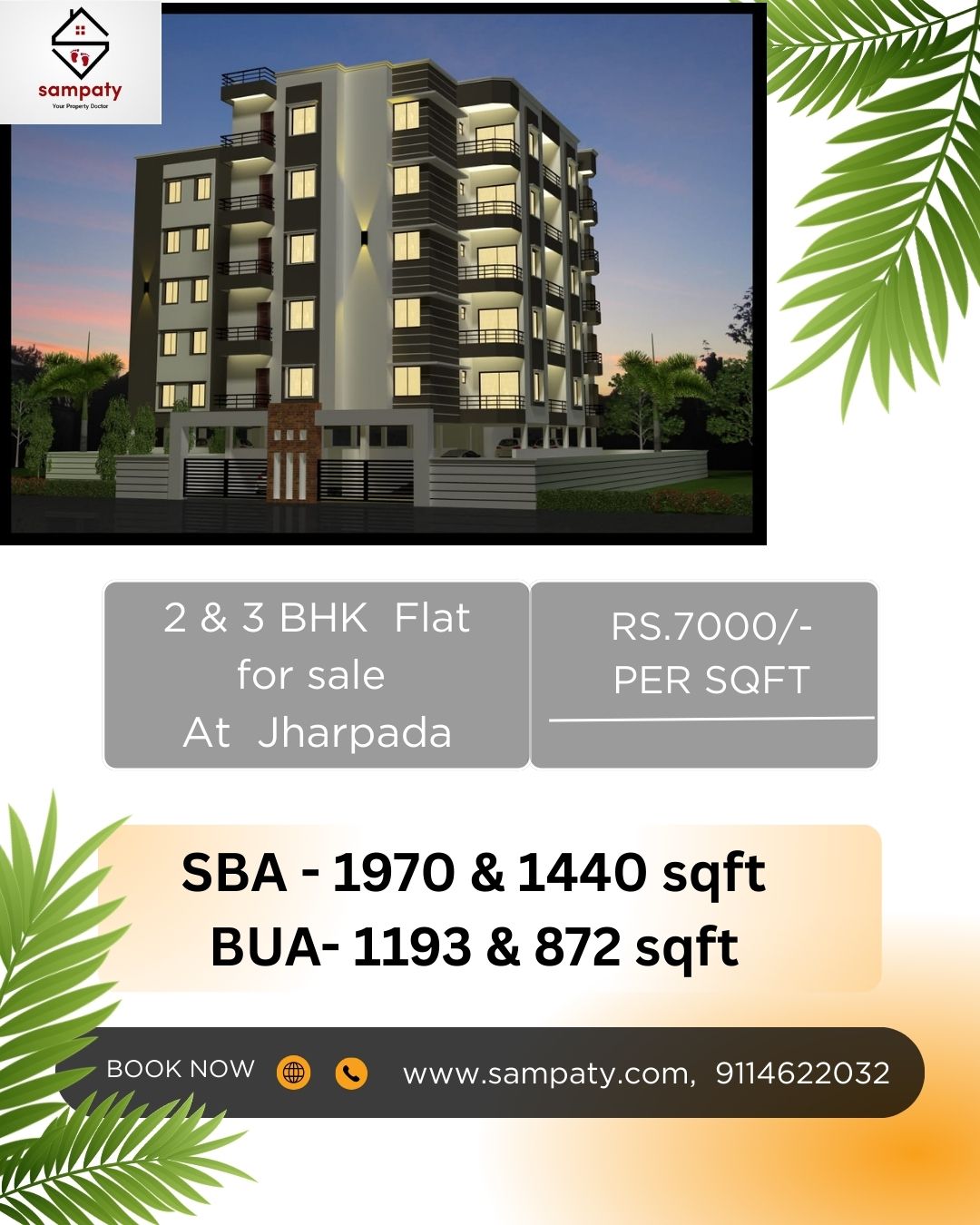 SBA- 1970 & 1400 sqft area, BUA-1193 & 872 sqft @ Rs. 7000/- per sqft 3 BHK & 2 BHK Flat For sale at Jharpada.